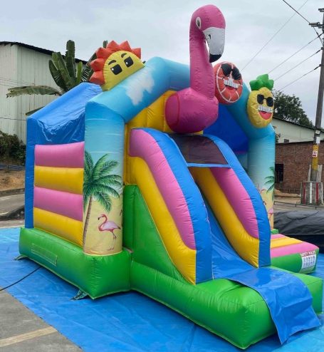 Unsere farbenfrohe Flamingo Hüpfburg mit Rutsche ist der absolute Hingucker auf jedes Sommer - Event.
