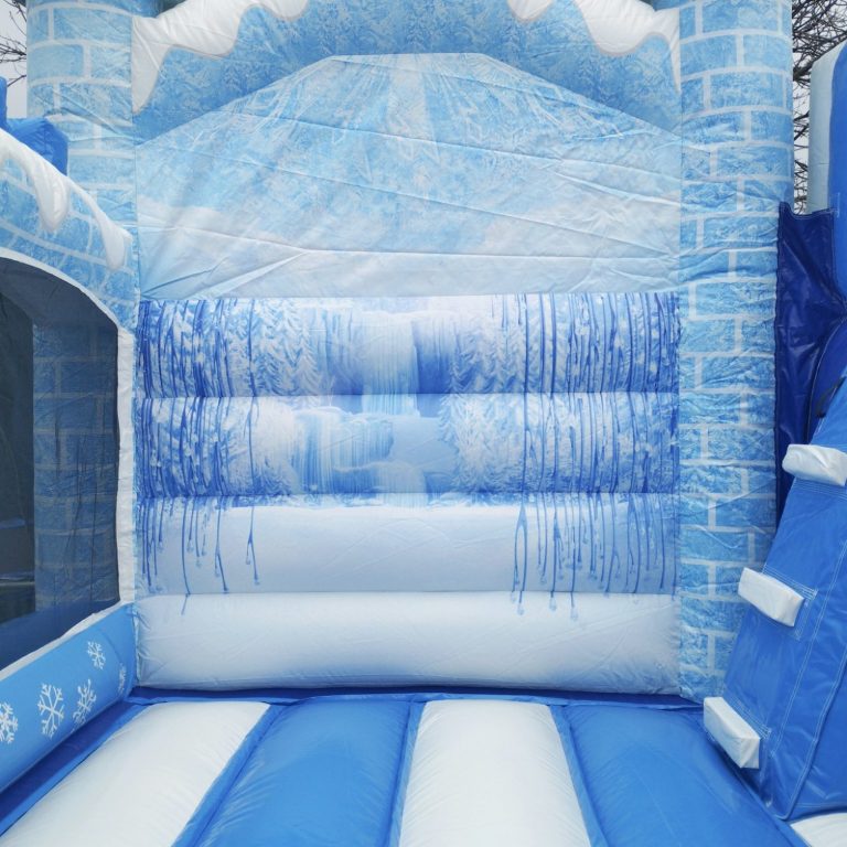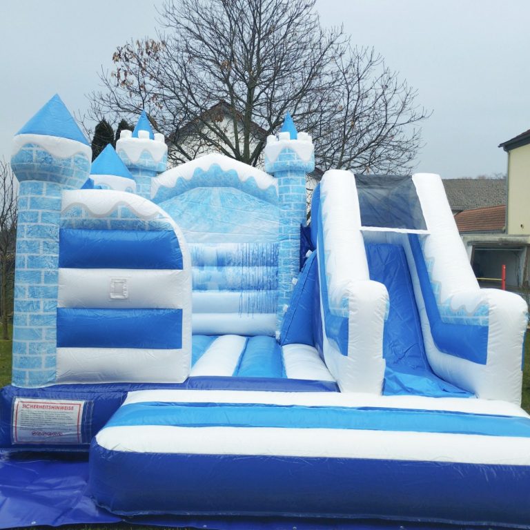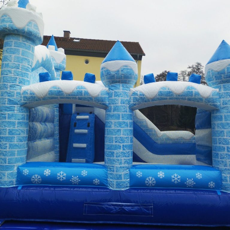 Diese Hüpfburg in strahlendem Blau und Weiß begeistert mit funkelnden Schneeflocken und märchenhaften Design.