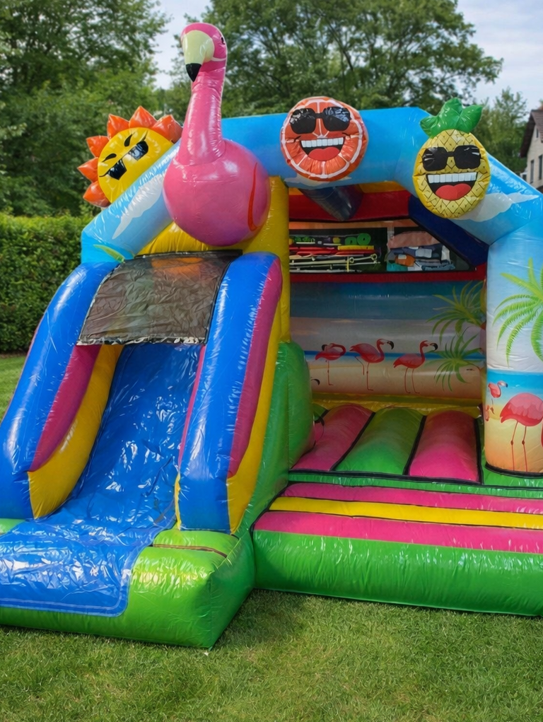 Unsere farbenfrohe Flamingo Hüpfburg mit Rutsche ist der absolute Hingucker auf jedes Sommer - Event.
